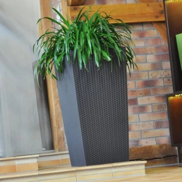 Een hoge vierkante bloempot met een leuke rattan look gemaakt uit robuuste kunststof.