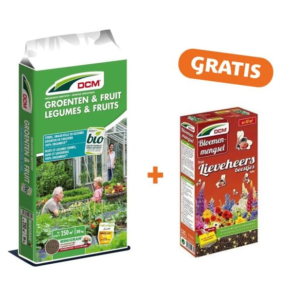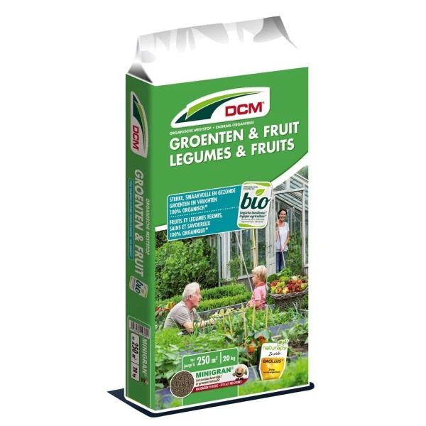DCM groenten en fruit BIO. Complete en 100 % organische meststof met een hoog kalium(potas)-gehalte voor dikke, stevige, gezonde en smaakvolle groenten, kruiden en vruchten. Bevat micro-organismen voor meer bodemleven, een betere voedingsopname en een optimale plantengroei.