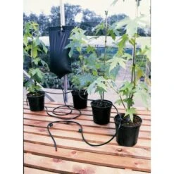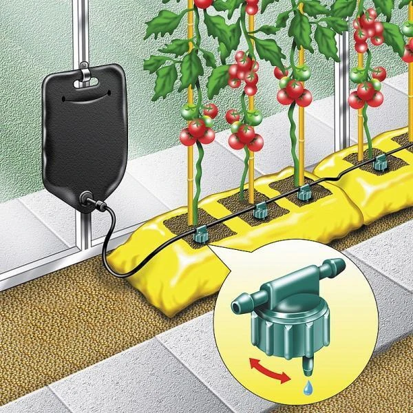 De waterzak van de druppelkit kan 10 liter water bevatten. Je kan de watertoevoer via 6 onafhankelijke druppelaars individueel regelen.
