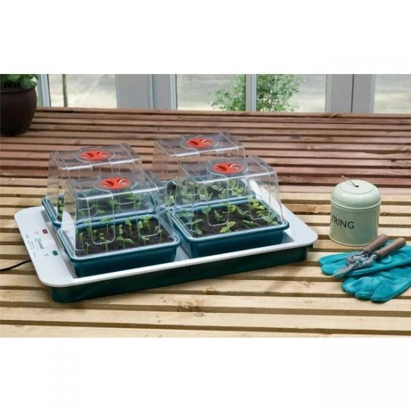 Kweek bloemen, groenten of kruiden in afzonderlijke kasjes. Deze vierdelige propagator is een complete verwarmde plantenkwekerij. De grootte van het toestel leent zich voor gebruik in een kas of op een tafelblad van de huiskamer. De verwarmde basis bevat een 50 Watt koolstofvezelelement voor gelijkmatige warmteverdeling en is voorzien van een ingebouwde vaste temperatuurthermostaat ontworpen voor de handhaving van een potgrondtemperatuur rond de 19 ° Celsius.