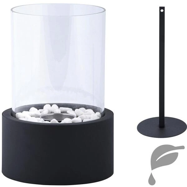 De basis van de lamp is gemaakt van metaal met zwarte coating waarin de brander rust. De vlam wordt omgeven door een glazen stolp die bovenaan open is en de meegeleverde witte steentjes zorgen voor een decoratieve touch.