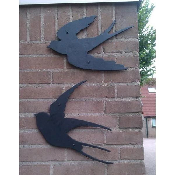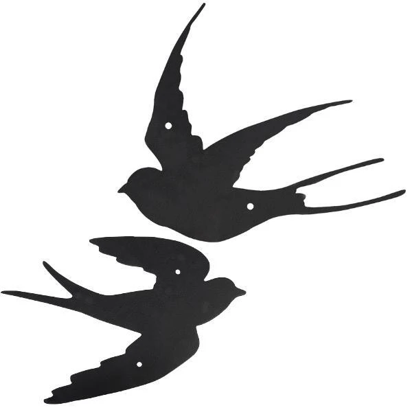 Set van twee sierlijke gietijzeren zwaluwen als muurdecoratie, geschikt om zowel binnen als buiten op te hangen.