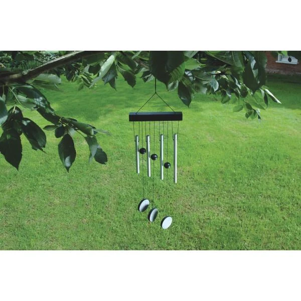 Door de holle metalen buizen en het contact tussen de houten balletjes, ontstaan er aangename rustgevende klanken. De windgong is weersbestendig en bestaat hoofdzakelijk uit staal en aluminium.
