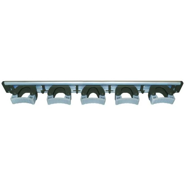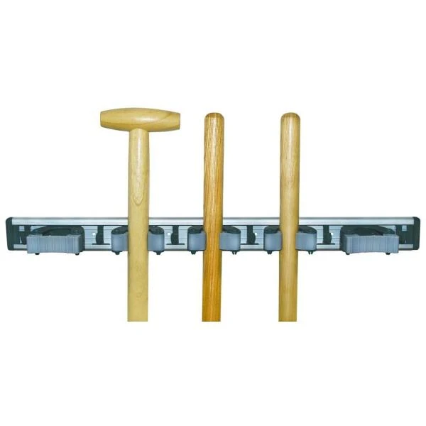 De rail is voorzien om vijf gereedschapsstelen op te hangen. Dankzij het ophangsysteem, klikt elke steel makkelijk tussen de rubberen draaidelen.