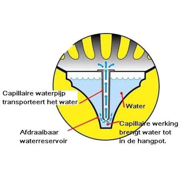 Hanging basket met besparend waterreservoir. Dagelijks gieten is niet meer nodig, dus bij het gebruik van deze hangpot bespaar je niet alleen water maar ook tijd. Het unieke ontwerp van deze hangpot is voorzien van een afdraaibaar waterreservoir. Vanuit deze watervoorraad is er een capillaire lont naar de pot voorzien zodat de planten zelf de gewenste hoeveelheid water uit de watervoorraad kunnen opnemen.