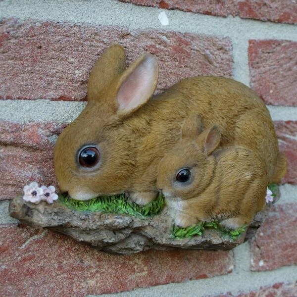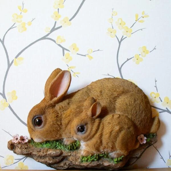Een schattig konijnenduo met heldere donkere ogen en opstaande oortjes. Dit schattige muurbeeld is een verfijnde en natuurlijke weergave van een moeder met jong en is gemaakt in duurzaam geschilderd polyresin.