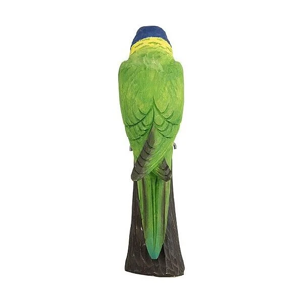 Ambachtelijk vormgegeven Lori van de Blauwe Bergen (Trichoglossus moluccanus). De vogel wordt op ware grootte weergegeven en is beschilderd met milieuvriendelijke verf.
