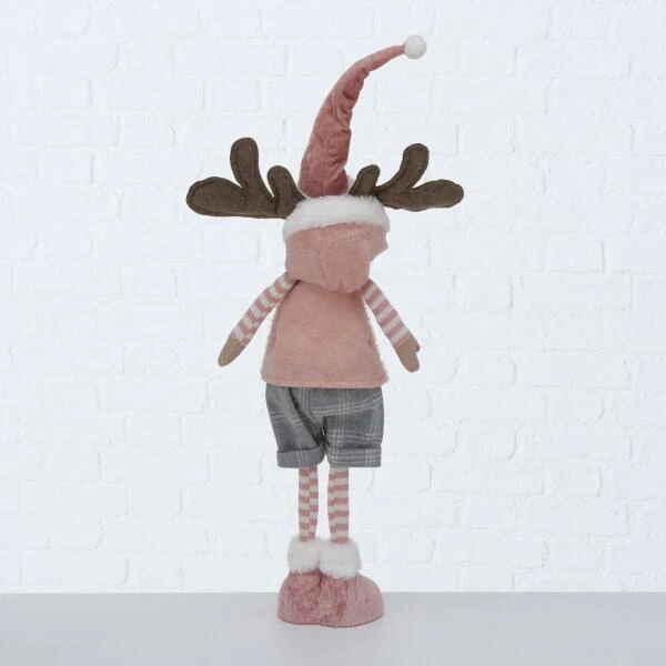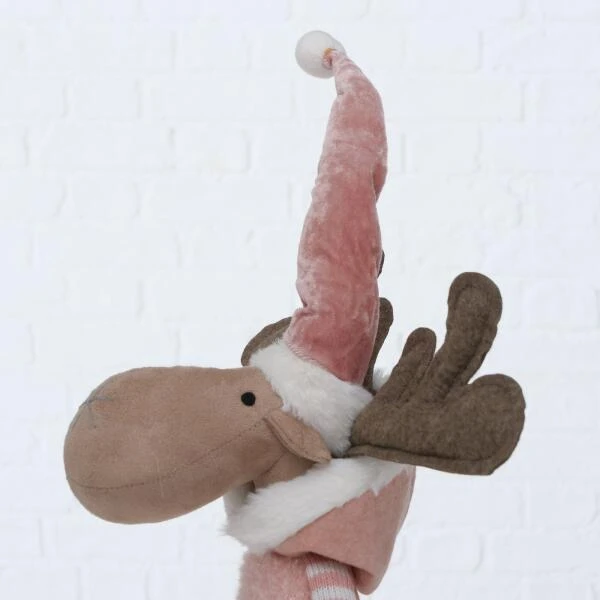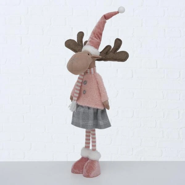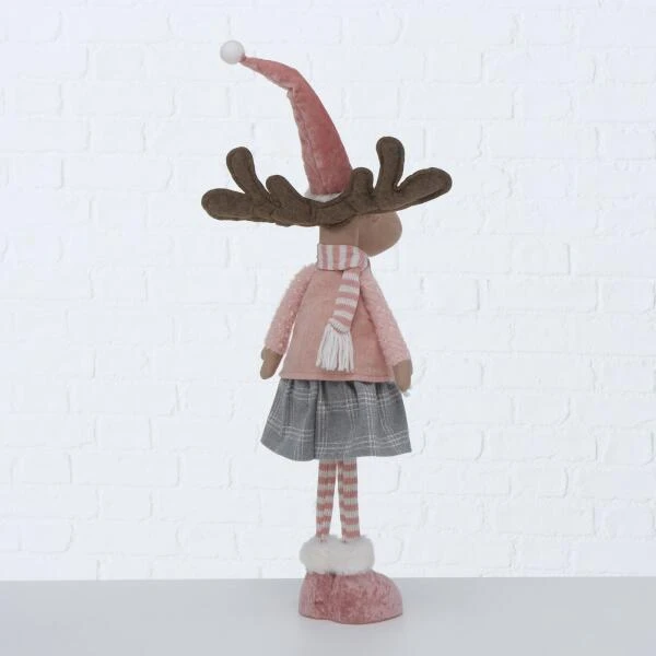 Breng de ultieme kerstsfeer naar je thuis met dit leuke set elanden. De ene eland draagt een broek en een jas met kap, de andere eland draagt een rok en een trui met sjaal. Hun outfits in de kleuren roze, grijs en wit passen mooi samen.