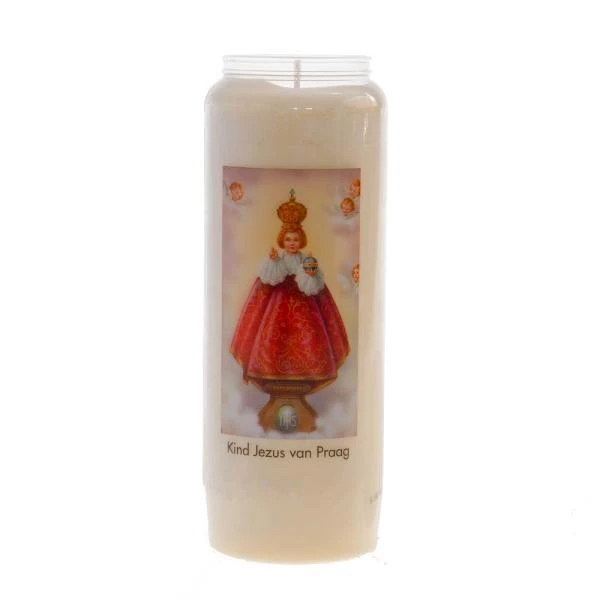 De kaars zit in een doorzichtige kunststof houder met een afbeelding en het opschrift “Kind Jezus van Praag“. Het Kindje Jezus van Praag is een wassen beeldje dat wonderen verricht. Het beeldje staat in de Maria Victoriakerk in Praag. Ieder jaar stromen duizenden pelgrims naar de kerk om te bidden en een kaars bij het beeldje aan te steken.