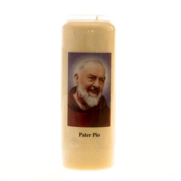 De kaars zit in een doorzichtige kunststof houder met een afbeelding en het opschrift “Pater Pio“. Pater Pio was een kapucijner pater die zichtbare stigmata had waardoor hij volgens sommigen verbonden was met Christus. In 2002 werd hij heilig verklaard.