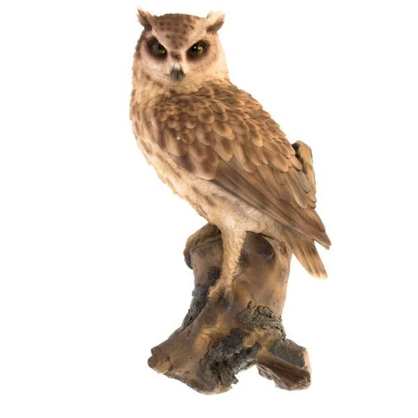 De oehoe is de grootste uilensoort in Europa. Deze uil wordt in de Engelse taal niet voor niets “Eagle Owl” genoemd. Kenmerkend aan de oehoe zijn de grote gele tot oranje ogen en de lange oorpluimen. Bij dit beeld werden alle details, van de donkere snavel tot het verenkleed zeer verfijnd weergegeven en met de hand geschilderd waardoor de uil net echt lijkt.