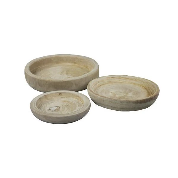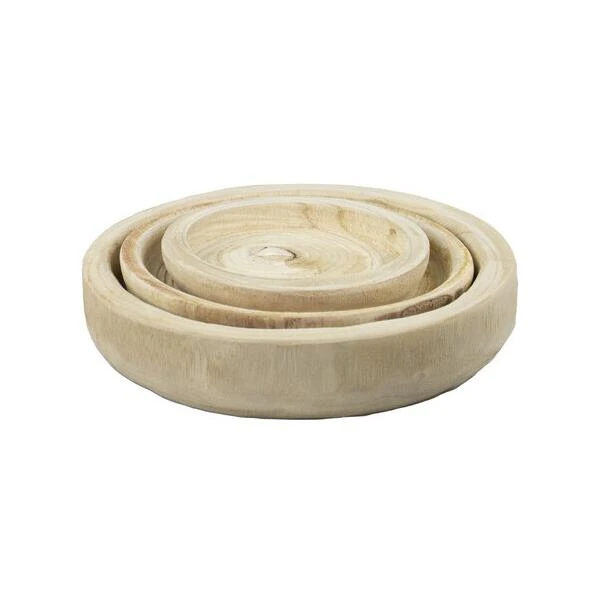 Een mooi set sierlijke houten schalen die perfect bij elkaar passen. Drie schalen in verschillende afmetingen gemaakt uit paulownia hout. Elke schaal is door zijn eigen specifieke kleur en houttekening uniek en samen vormen ze een fraai geheel, ideaal als aankleding van de tafel of dressoir.