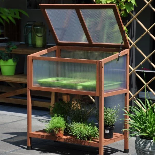 Het hout is verduurzaamd, heeft een bruine kleur en is afkomstig uit duurzaam beheerde bossen. De kweekbak is voorzien van een dichte houten bodem en heeft een afdichting in 4 mm polycarbonaat. De bovenkant kan opengeklapt worden en is voorzien van raamuitzetters met vleugelmoer en windvaste borging in verschillende standen. Bovendien is er onderaan een extra schap in hout voorzien waar je gereedschap op kwijt kunt of nog extra planten kunt zetten.
