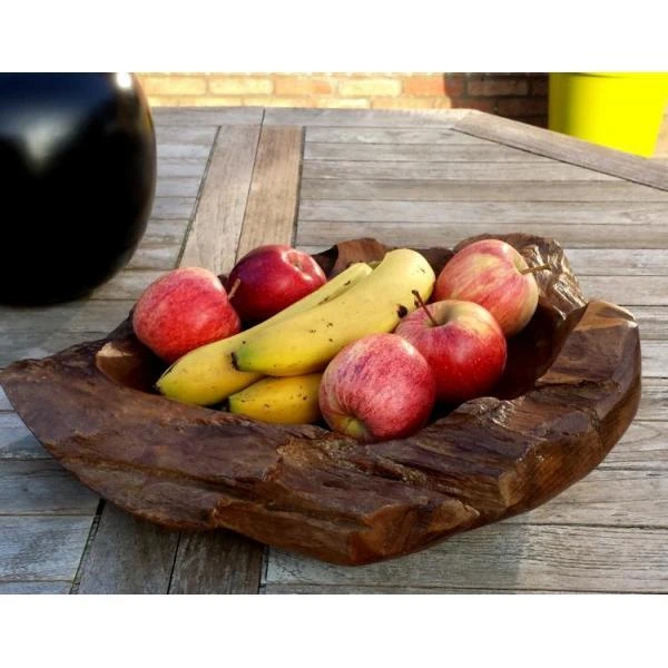 Deze robuuste schaal uit massief hout is een pronkstuk in elke woonkamer of op elk terras.