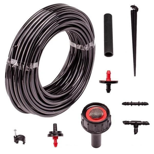 Dit handige micro- watergeefsysteem kan je gemakkelijk op eender welke 3/4” (ca. 1,9 cm) kraan aansluiten om zo druppelsgewijs plantenbakken of hanging baskets van water te voorzien.