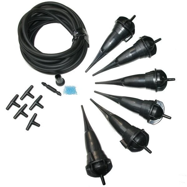 Met behulp van de meegeleverde aansluitstukken kan u de waterdarm eenvoudig aansluiten op het waterresevoir van 12 liter. Op de waterdarm sluit u zelf de regelbare druppelaars aan op de gewenste afstand. Elke druppelaar is afzonderlijk regelbaar volgens de waterbehoefte van de plant en heeft 11 standen.