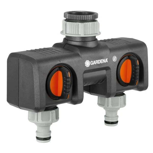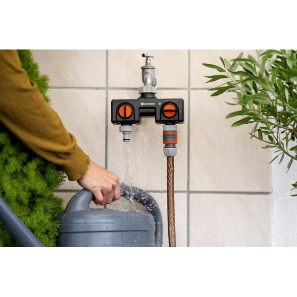 Met de GARDENA 2-weg-waterverdeler sluit je gelijktijdig 2 accessoires aan op één kraan. De uitgangen zijn traploos regelbaar.