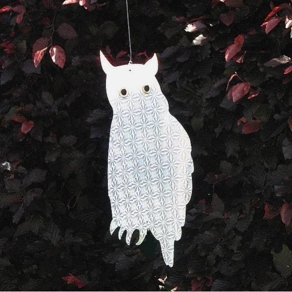 Vogels weren uit de tuin met reflecterende hologram uilen. Ideaal voor wering o.a. uit fruitbomen, moestuin, siertuin, balkon, terras,…