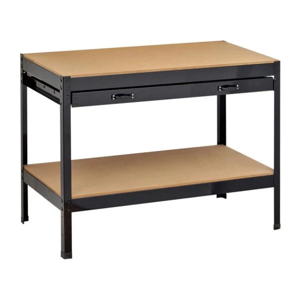 Deze stevige en stabiele werkbank met één opberglade heeft een houten werkblad in MDF met een dikte van 12 mm. Bovendien is deze werktafel uitgerust met een gelijkaardig onderblad waar je gemakkelijk al jouw gereedschap kwijt kan.